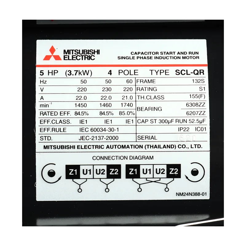 มอเตอร์ MITSUBISHI รุ่น SCL-QR กำลัง 5 แรงม้า (3.7 กิโลวัตต์) 1 เฟส 220 โวลต์ 4 โพล 2 สาย IP22 ความเร็วรอบ 1450 RPM (รอบต่อนาที)