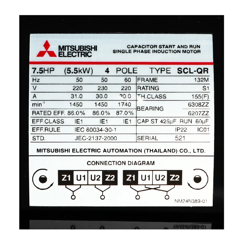 มอเตอร์ MITSUBISHI รุ่น SCL-QR กำลัง 7.5 แรงม้า (5.5 กิโลวัตต์) 1 เฟส 220 โวลต์ 4 โพล 2 สาย IP22 ความเร็วรอบ 1450 RPM (รอบต่อนาที)