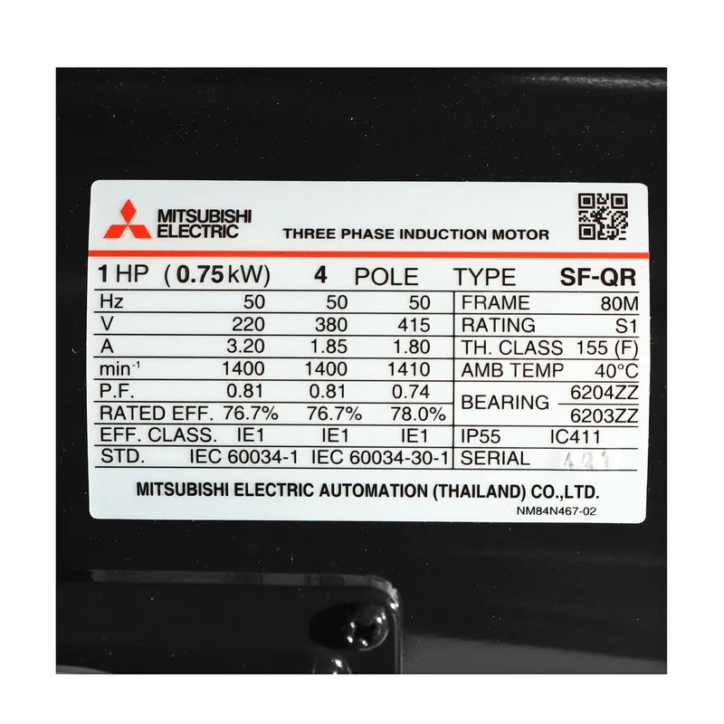 MITSUBISHI มอเตอร์ รุ่น SF-QR กำลัง 1 แรงม้า (0.75 กิโลวัตต์) ชนิดหุ้มมิด 3 เฟส 220/380 โวลต์ 4 โพล 3 สาย IP55 ความเร็วรอบ 1450 รอบ/นาที (มิตซูบิชิ)