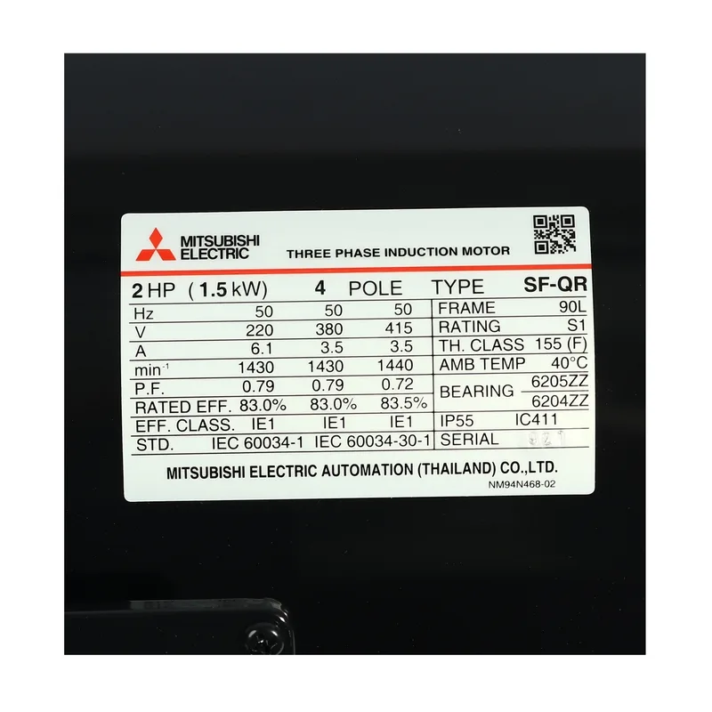 MITSUBISHI มอเตอร์ รุ่น SF-QR กำลัง 2 แรงม้า (1.5 กิโลวัตต์) ชนิดหุ้มมิด 3 เฟส 220/380 โวลต์ 4 โพล 3 สาย IP55 ความเร็วรอบ 1450 รอบ/นาที (มิตซูบิชิ)