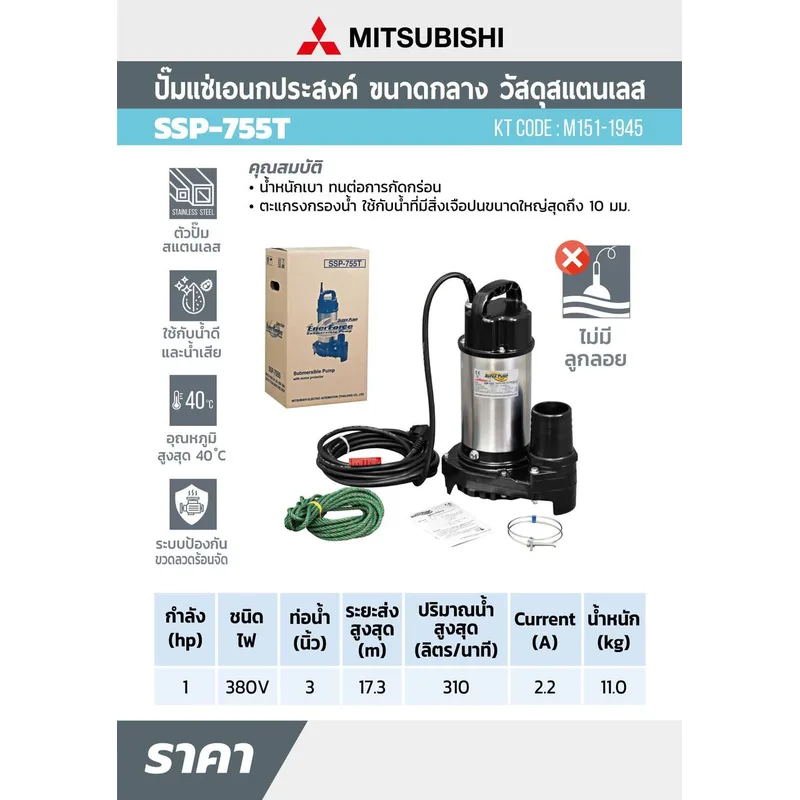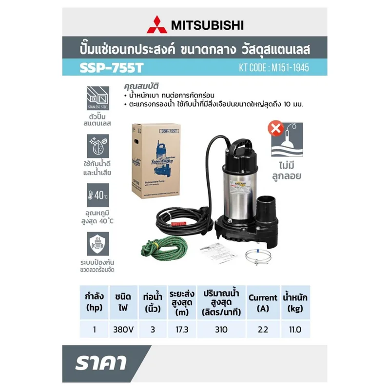 ปั๊มจุ่มดูดน้ำสแตนเลส มิตซูบิชิ (MITSUBISHI) รุ่น SSP-755T