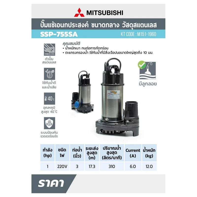 ปั๊มจุ่มดูดน้ำสแตนเลส มิตซูบิชิ (MITSUBISHI) รุ่น SSP-755SA