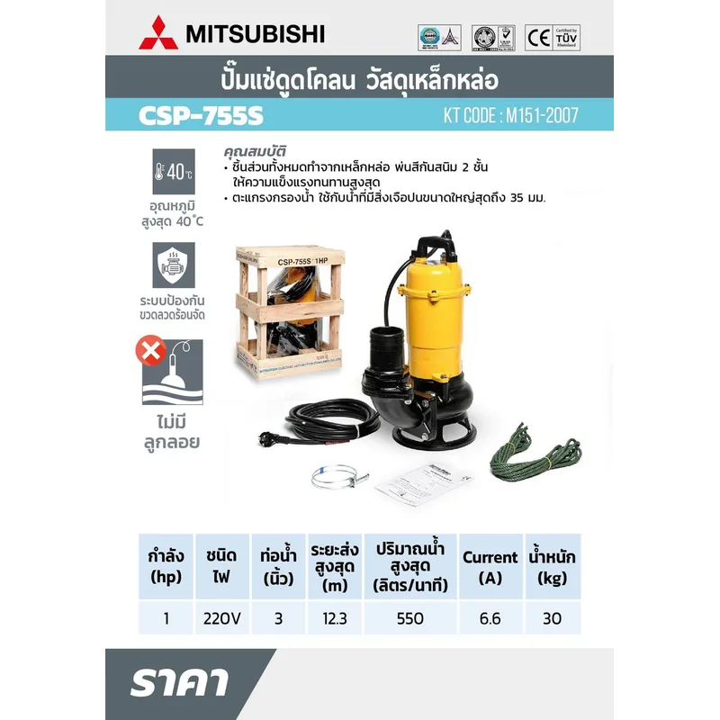 MITSUBISHI CSP-755S ปั๊มแช่ดูดโคลน ท่อ 3″(1HP) 1เฟส