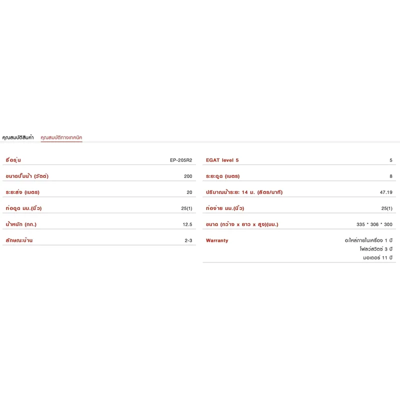 - ปริมาณน้ำ: 59 ลิตร/นาที (สูงสุด), 50 ลิตร/นาที (ระยะ 12 เมตร)