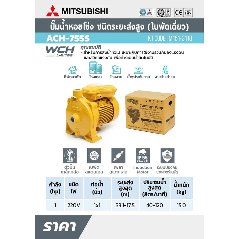 ปั๊มน้ำหอยโข่ง ชนิดแรงดันสูง มิตซูบิชิ (MITSUBISHI) รุ่น ACH-755S