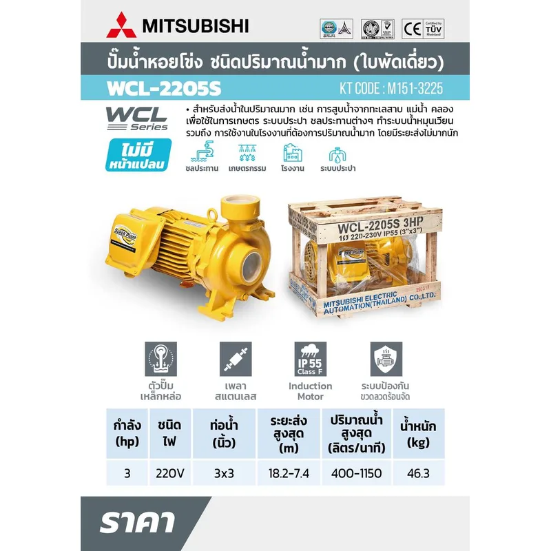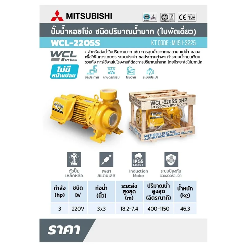 ปั๊มน้ำหอยโข่ง ชนิดปริมาณน้ำมาก มิตซูบิชิ (MITSUBISHI) รุ่น WCL-2205S