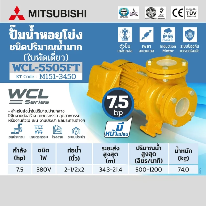 MITSUBISHI WCL-5505F-T ปั๊มหน้าแปลนน้ำมาก7.5HP 3เฟส