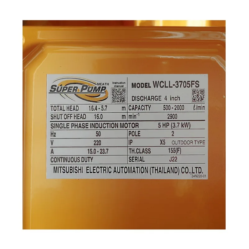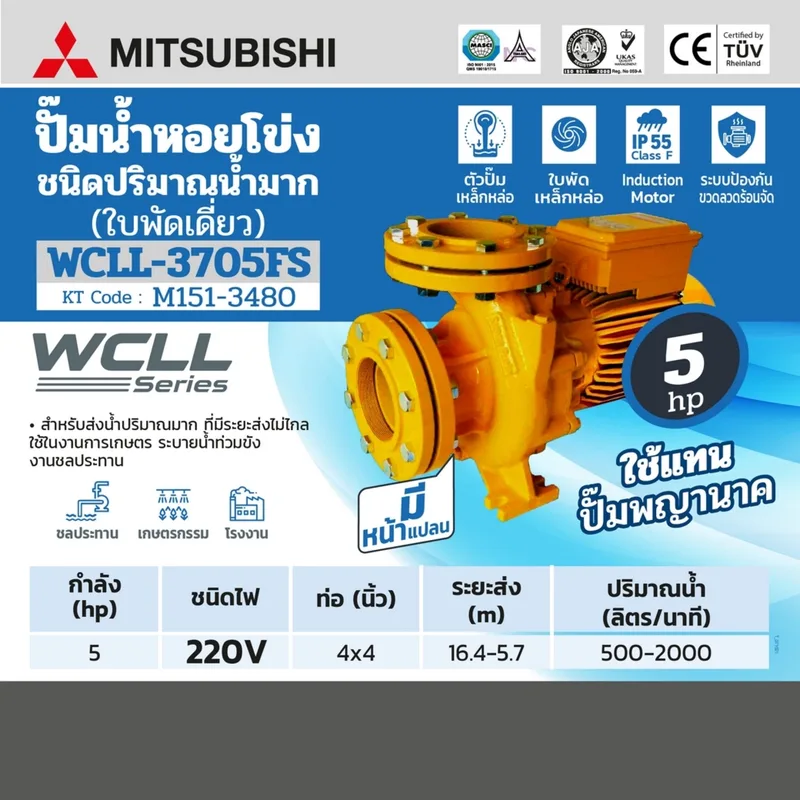 MITSUBISHI ปั๊มหอยโข่งหน้าแปลนชนิดน้ำมาก รุ่น WCLL-3705FS ขนาด 5 HP ไฟ 220V ขนาดท่อ 4″x4″ กำลังส่ง 16.4-5.7 เมตร ปริมาณน้ำ 500-2000 ลิตร/นาที ใช้ทดแทนปั๊มพญานาค (มิตซูบิชิ)