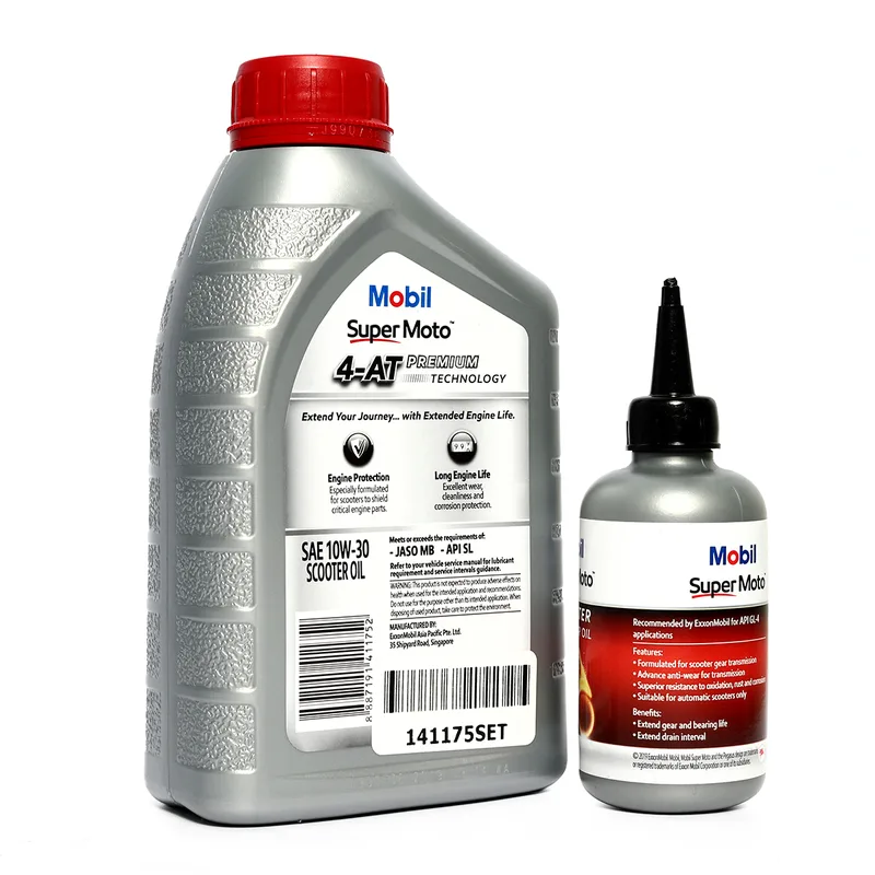 น้ำมันหล่อลื่นเครื่องยนต์เบนซินสำหรับรถมอเตอร์ไซค์เกียร์ออโตเมติก กึ่งสังเคราะห์ โมบิล (MOBIL) รุ่น ซูเปอร์ โมโต สกูตเตอร์ 10W-30 ขนาดบรรจุ 0.8 ลิตร และ น้ำมันเฟืองท้ายเครื่องยนต์เบนซินสำหรับรถมอเตอร์ไซค์เกียร์ออโตเมติก โมบิล รุ่น ซูเปอร์ โมโต สกูตเตอร์ 8