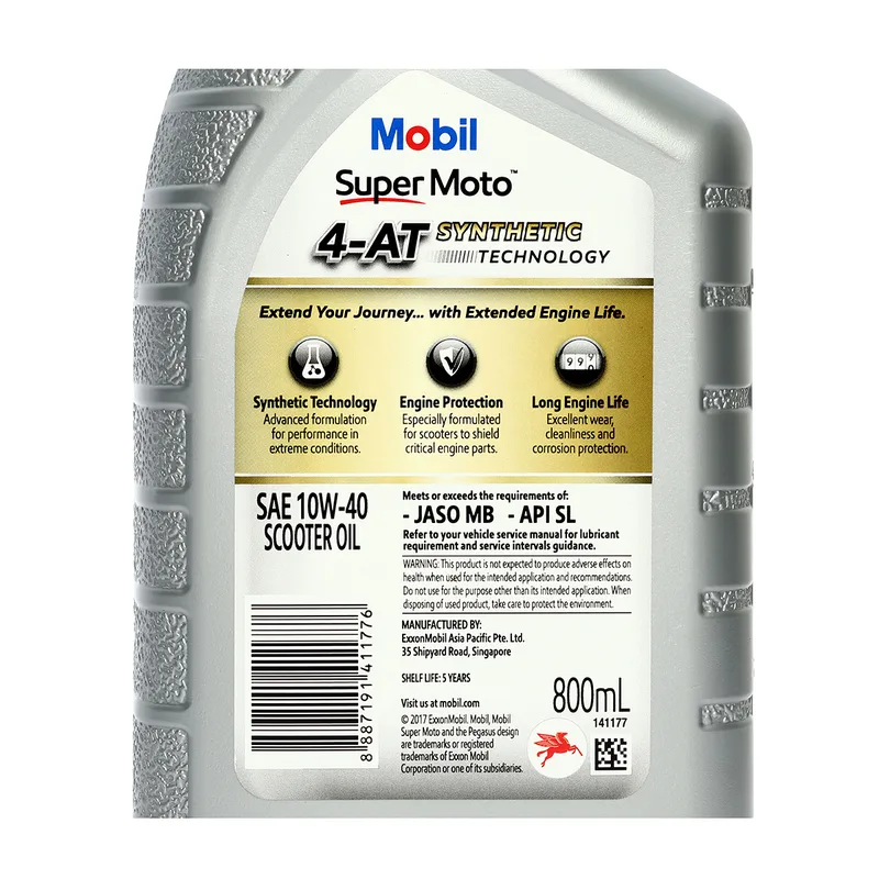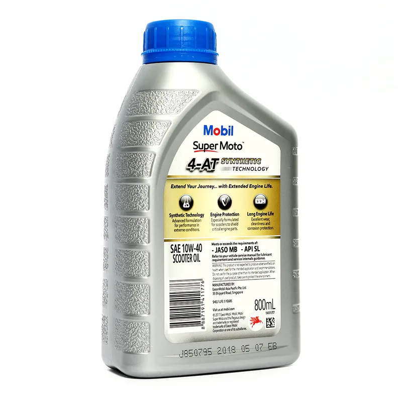 น้ำมันหล่อลื่นเครื่องยนต์เบนซินสำหรับรถมอเตอร์ไซค์เกียร์ออโตเมติก กึ่งสังเคราะห์ โมบิล (MOBIL) รุ่น ซูเปอร์ โมโต สกูตเตอร์ 10W-40 ความหนืด SAE 10W-40 ขนาดบรรจุ 0.8 ลิตร