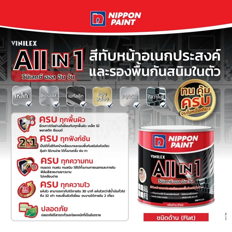 นวัตกรรมสีอเนกประสงค์ Vinilex All in 1 รวม “สีรองพื้นกันสนิม” และ “สีทับหน้า” ไว้ในถังเดียว (2-in-1) แห้งไว งานเสร็จเร็ว ทาได้ทุกพื้นผิวโลหะและไม้