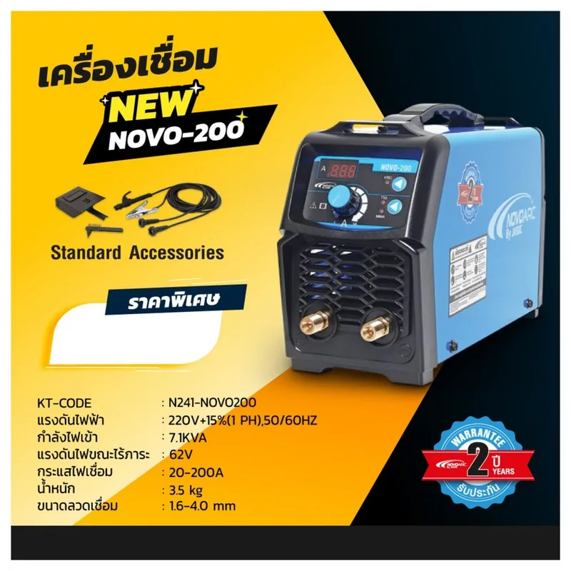 เครื่องเชื่อม (IGBT) NOVOARC รุ่น NOVO-200 กระแสไฟเชื่อม 200 แอมป์ กำลังไฟ 7.1 กิโลโวลต์แอมป์ รับประกัน 2 ปี