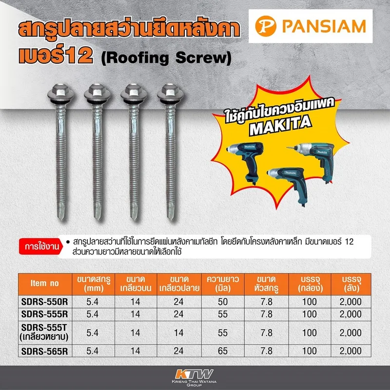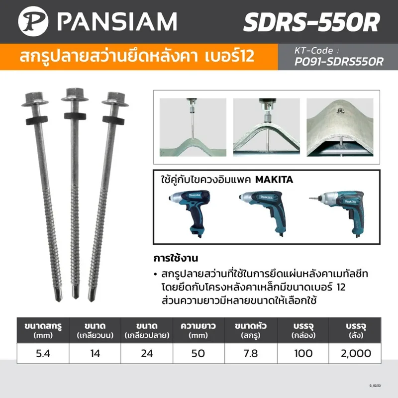 PANSIAM สกรูปลายสว่านยึดหลังคา เบอร์ #12 ความยาว 50 มม. รุ่น SDRS-550R