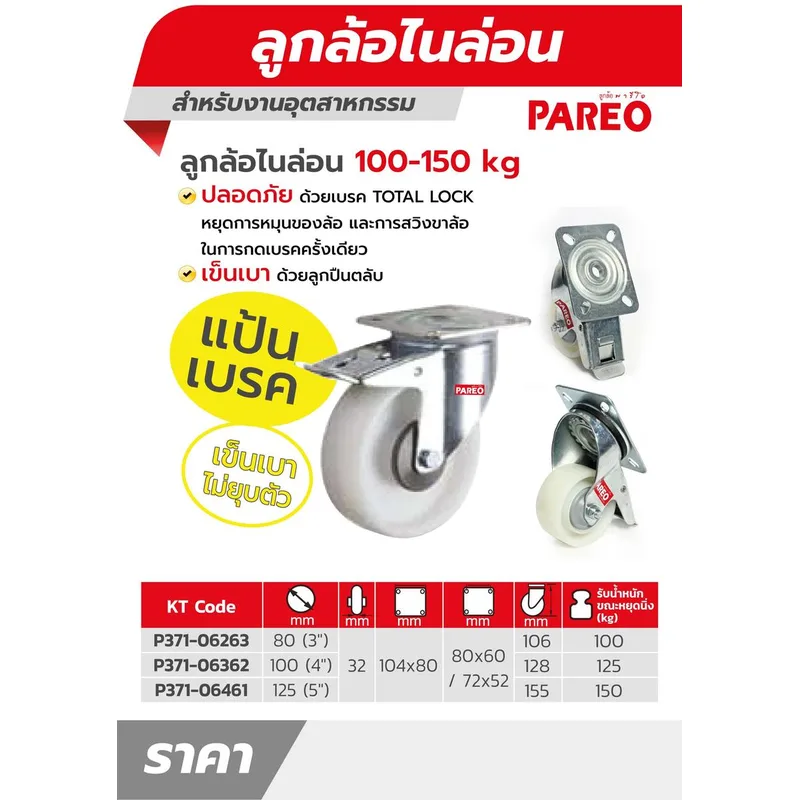 PAREO ลูกล้อไนล่อนขาเหล็กชุบซิงค์ แป้นเบรค 80 มม. (3 นิ้ว ) รับน้ำหนักได้ 100 กก.