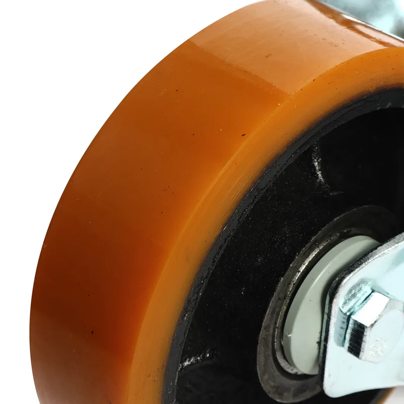 ลูกล้อโพลียูรีเทนแกนเหล็กหล่อ แป้นตาย ขนาด 100 มิลลิเมตร (4 นิ้ว) รับน้ำหนักได้ 125 กก. ไม่ทำให้พื้นเป็นรอย ทนทานสารเคมี ไม่ทิ้งคราบ และไม่ยุบตัว