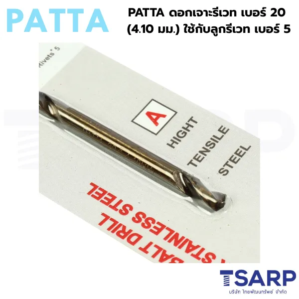 - PATTA ดอกเจาะรีเวท เบอร์ 20 ขนาด 4.10 มม. สำหรับใช้คู่กับคีมย้ำรีเวทและลูกรีเวทเบอร์ 5