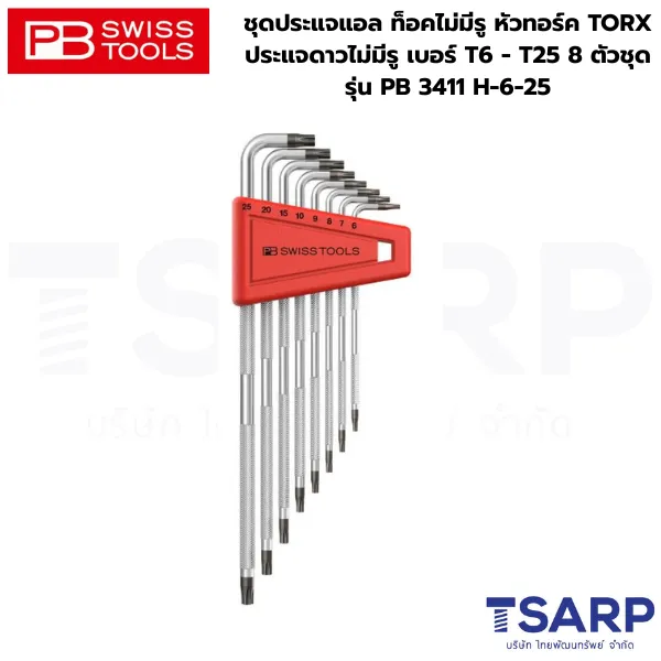 PB SWISS ชุดประแจแอล ท็อคไม่มีรู หัวทอร์ค TORX ประแจดาวไม่มีรู เบอร์ T6 – T25 8 ตัวชุด รุ่น PB 3411 H-6-25