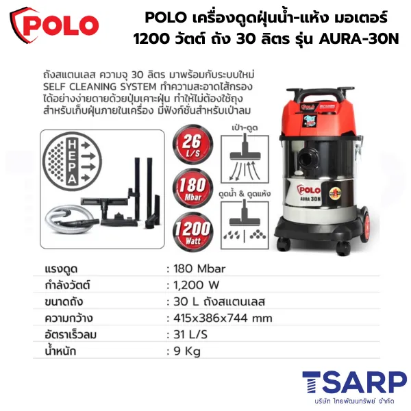 POLO รุ่น AURA-30N คือเครื่องดูดฝุ่นอเนกประสงค์รุ่นยอดนิยมที่ขยับขึ้นมาเป็นระดับงานหนัก (Heavy Duty) มากขึ้น ด้วยจุดเด่นของตัวถังที่ทำจาก สแตนเลสคุณภาพสูง ขนาดใหญ่ถึง 30 ลิตร ทำให้มีความทนทานต่อการกัดกร่อน ไม่เป็นสนิม และรองรับการใช้งานต่อเนื่องในพื้นที่ขนาดกว้างได้ดีเยี่ยม ไม่ว่าจะเป็นการดูดน้ำที่เปียกชื้นหรือฝุ่นแห้งจำนวนมาก