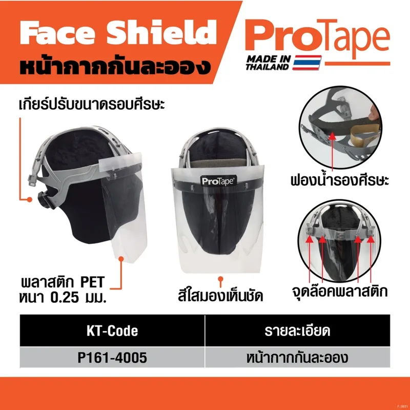 FaceShield หน้ากากกันละออง โปรเทป (PROTAPE) มีระบบเกียร์ปรับขนาดรอบศีรษะได้ แผ่นพลาสติก PET หนา 0.25 มม.