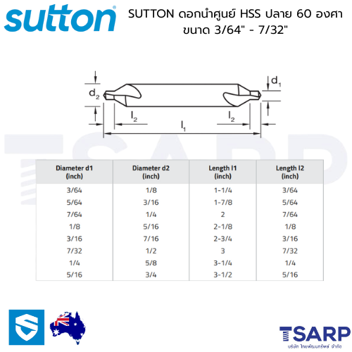 - SUTTON ดอกนำศูนย์ HSS ปลาย 60 องศา ขนาด 3/64″ – 7/32″