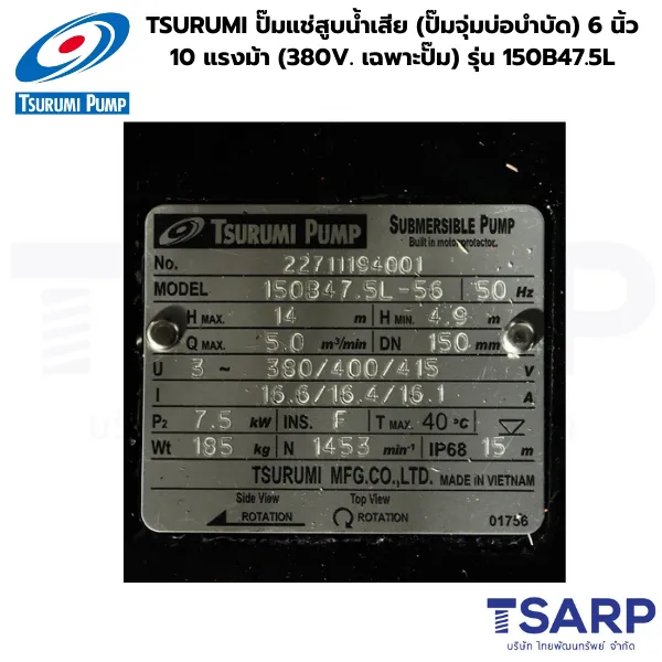 TSURUMI ปั๊มแช่สูบน้ำเสีย (ปั๊มจุ่มบ่อบำบัด) 6 นิ้ว 10 แรงม้า 380V รุ่น 150B47.5L (เฉพาะปั๊ม)