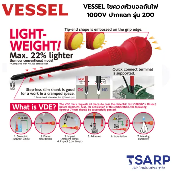 • VESSEL ไขควงบอลกันไฟ 1000V ปากแฉก รุ่น 200 นี่คือไขควงที่ผ่านการทดสอบอย่างเข้มงวดถึง 7 ขั้นตอนตามมาตรฐานสากล IEC60900 และได้รับการรับรอง VDE (สถาบันทดสอบและออกใบรับรองในเยอรมนี) ซึ่งรับประกันว่าไขควงนี้สามารถป้องกันไฟฟ้าได้สูงถึง 1000 โวลต์